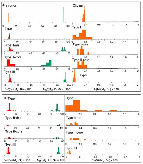 Histogram of Mg (green), Fe (red) and Ni (orange) mol ratio in olivine and the different types of serpentine identified in the (a) lherzolite and (b) harzburgite-dunite bedrock.