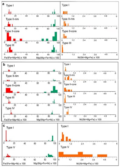 Histogram of Mg (green), Fe (red) and Ni (orange) mol ratio in the different types of serpentine identified in the saprock derived from (a) lherzolite (b) harzburgite-dunite and (c) clinopyroxenite bedrock.