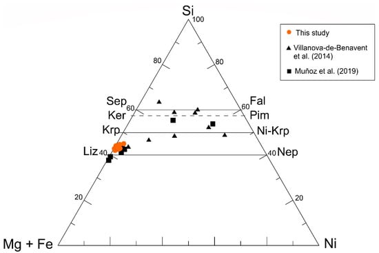 Si-Mg-(+Fe)-Ni plot showing the composition of serpentine-like garnierite in this study and previous works. Lz—lizardite, Nep—népouite, Krp—karpinskite, Ni-Krp—Ni-karpinskite, Ker—kerolite, Pim—pimelite, Sep—sepiolite, Fal—falcondoite.