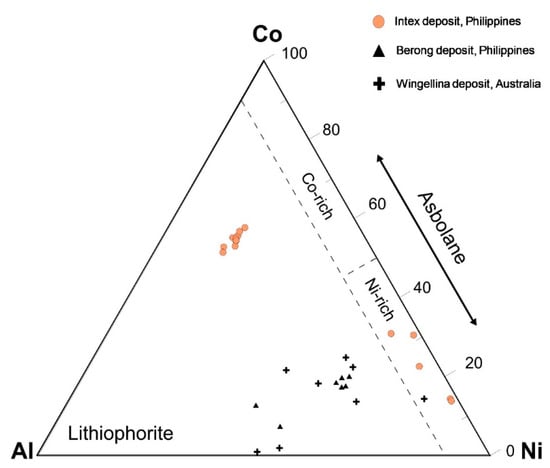 The mineral chemistry data show that both minerals contain significant amounts of CoO (up to 11.3 wt%) and NiO (up to 15.6 wt%). The sorption of Ni by Mn oxyhydroxides depends on structural and physicochemical parameters [], and the presence of Al in the solution at a pH above 6 []. In this study, asbolane was found in abundance in the limonite horizon with a pH value above 7.29, whereas a lithiophorite-asbolane intermediate was found around pH 6.32. The results suggest that lithiophorite-asbolane intermediates form at approximately around pH 6 and asbolane is precipitated at higher pH (pH above 7). Asbolane shows a lower Co/Ni ratio (0.32) in contrast to the lithiophorite-asbolane intermediate, which has a higher Co/Ni ratio of 3.35. Taking into account the difference in pH and Co/Ni ratio of these minerals, these results, therefore, show that under slightly acidic conditions (pH 6), Co is more closely associated with a lithiophorite-asbolane intermediate.