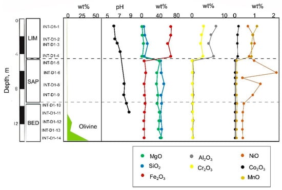Distribution of olivine, pH and elements with depth in the laterite derived from harzburgite-dunite bedrock (BB2406 core).