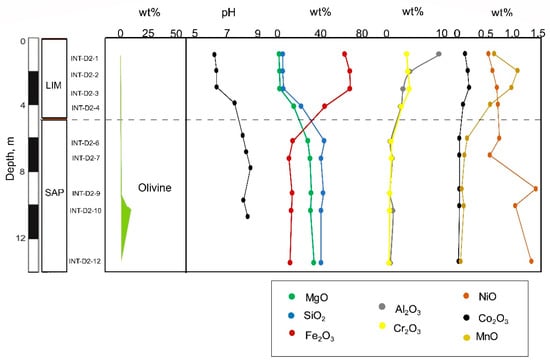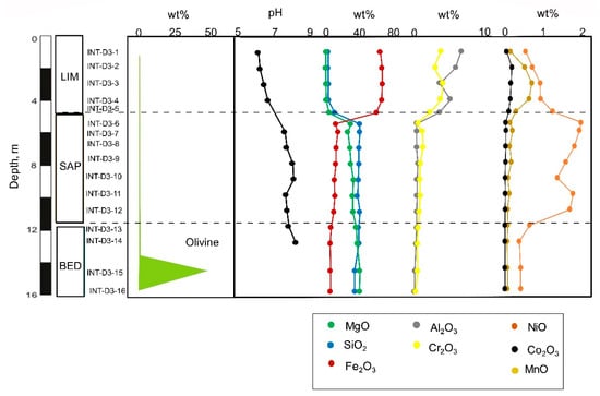 Distribution of olivine, pH and elements with depth in the laterite derived from lherzolite bedrock (BB2515 core).