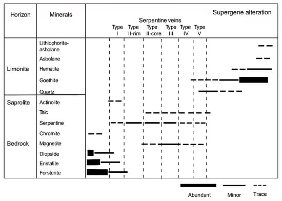 The NiO concentration of olivine (0.37 wt%), orthopyroxene (0.07 wt%), clinopyroxene (0.04 wt%), and talc (0.07 wt%) (Table 1) indicate that olivine is the major source of Ni in the saprolite and limonite horizons. The initial serpentinization of peridotite and pyroxenite results in the formation of type I serpentines. Continuous serpentinization leads to the formation of type II-rim serpentine veins, which is followed by type II-core and later by type III veins in the studied bedrock (Figure 18). This sequence is identical in the bedrock and saprock, suggesting a similar generation of serpentinization.