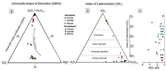 The IOL values of the bedrock are in the range of 14 to 19, and the saprolite up to 17. However, the limonite from Intex deposit exhibits higher IOL values, reaching up to 94 (Figure 19b). Earlier studies reported that unweathered ultramafic rocks have IOL values of less than 40 []. Even though the IOL values of the saprolite are low, weak weathering was observed under the microscope. Conversely, the sample from the transition boundary has a higher IOL value (46), corresponding to the point in the middle section of the SiO2-Al2O3-Fe2O3 (SAF) ternary diagram, which indicates a significant loss of silica (Figure 19b). As lateritization progresses, more silica is leached, resulting in the relative enrichment of Fe. Samples from the saprolite and limonite horizons show an apparent increase in Ni (Figure 19c).