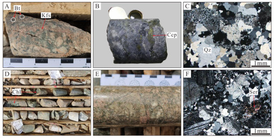 Photographs and photomicrographs of representative hydrothermal alteration features in the Fukeshan Cu (Mo) deposit. (A) Pervasive potassic alteration assemblages are mainly composed of secondary K-feldspar and biotite. (B) Intensive silicic alteration, associated with dense disseminated chalcopyrite. (C) Silicic alteration in the granodiorite. (D) Potassic alteration locally overprinted by chlorite alteration in the granodiorite. (E) Pervasive illite/sericite replaced feldspars and mafic minerals, showing a yellow-green color. (F) Phyllic alteration in the granodiorite, with sericite replace feldspar. Abbreviations: Qz, quartz; Kfs, K-feldspar; Bt, Biotite; Chl, Chlorite; Ser, sericite; and Ccp, chalcopyrite.