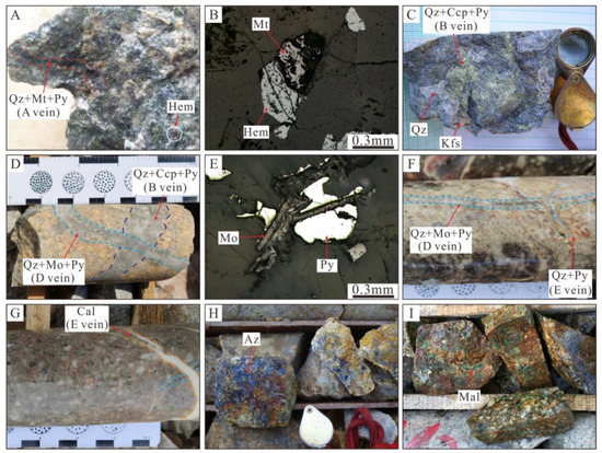 Stage I is characterized by sulfide-barren quartz veins, similar to A veins as defined by [35], which generally consist of quartz (70–80 vol %), pyrite (5 vol %), chalcopyrite (ca. 5 vol %), magnetite (5–10 vol %), and hematite (ca. 5 vol %). Stage I veins are rarely observed. No obvious crosscutting relations are observed between stage I veins and other veins. These veins are discontinuous (Figure 4A) and are mostly concentrated in the potassic alteration core (relative to other late alterations), in which plagioclase and mafic minerals have been replaced pervasively by secondary K-feldspar and biotite, respectively. Stage II, which is the main Cu mineralization stage, is characterized by quartz + chalcopyrite + pyrite veins, similar to B veins described by [35]. Stage II veins are also mostly concentrated in the potassic alteration core relative to other late alterations. Stage II veins mainly contain quartz (65–75 vol %), chalcopyrite (5–10 vol %), pyrite (5–10 vol %), bornite (<5 vol %), and molybdenite (ca. 5 vol %). These veins are more continuous than stage I veins (Figure 4D). Stage III veins are generally associated with phyllic alteration, similar to D veins described by [35]. These veins are relatively continuous (Figure 4D,F), generally containing quartz (65–75 vol %), sericite (ca. 5 vol %), molybdenite (5–10 vol %), chalcopyrite (ca. 5 vol %), pyrite (ca. 5 vol %), sphalerite (<2 vol %), and galena (<2 vol %) (Figure 4E). Stage IV veins (E vein) generally contain quartz (>95 vol %), and minor carbonate and pyrite (Figure 4F,G). These veins postdating all early-formed veins and alteration types, represent the waning stage of the hydrothermal event in the Fukeshan Cu (Mo) deposit. Occasional pyrite (<3 vol %) is the only sulfide observed in stage IV veins. In addition, at shallow levels, the primary chalcopyrite was replaced by lower temperature supergene mineralization such as malachite and azurite (Figure 4H,I).