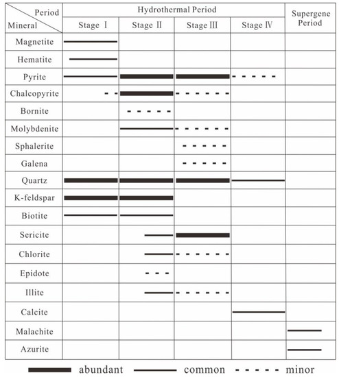 Paragenetic sequence of the major minerals of the Fukeshan Cu (Mo) deposit.