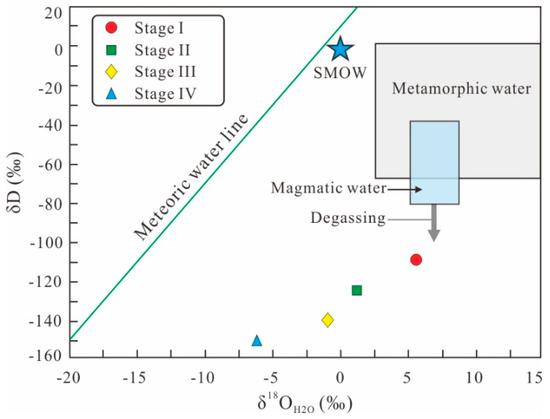 The H and O analytical results are listed in Table 2 and shown in Figure 9. The measured δ18OV-SMOW values of four quartz samples from four mineralization stages range from 6.2 to 9.0‰. The quartz–water equilibrium equation was used to calculate the δ18OH2O values (1000lnαquartz–water = 3.38 × 106/T2 − 3.4) [47]. The calculated δ18OH2O values from stages I to IV are 5.6‰, 1.2‰, −1.0‰, and −6.2‰, respectively (Table 2). The measured δD values of FIs in quartz from stages I to IV are –109.9‰, −125.7‰, −140.9‰, and −152.3‰, respectively (Table 2).