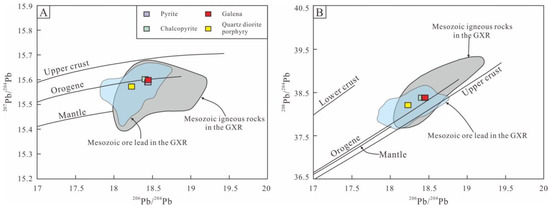 Lead isotopic compositions of sulfides and quartz diorite porphyry in the Fukeshan Cu (Mo) deposit. (A) 207Pb/204Pb vs. 206Pb/204Pb. (B) 208Pb/204Pb vs. 206Pb/204Pb. The evolution line of mantle, orogene, and the lower and upper crust reservoirs are from [55]. Pb isotope data for Late Jurassic–Early Cretaceous ore in the GXR are from [51,52,56]. Pb isotope data for Mesozoic igneous rocks in the GXR are from [57].