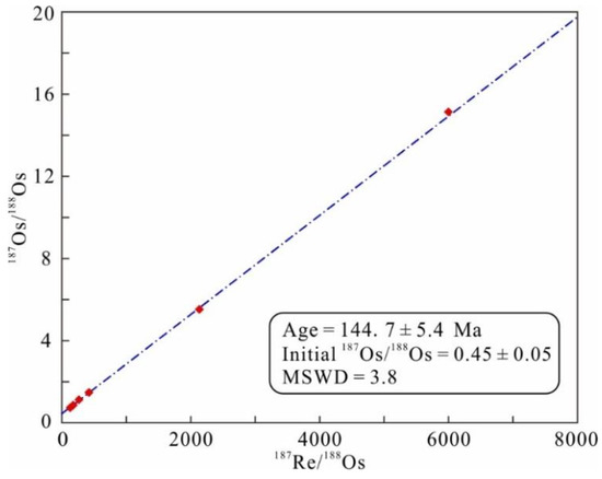 Table 5 presents the Re–Os isotope compositions of six chalcopyrite samples from mineralization stage II in the Fukeshan deposit. The concentrations of Re and common Os in the samples range from 0.4177 to 3.7997 ng/g and from 0.0021 to 0.0515 ng/g, respectively. Their 187Re/188Os values range from 130 to 5997, and their 187Os/188Os ratios range from 0.738 to 15.1. The data for the six chalcopyrite samples yielded an isochron age of 144.7 ± 5.4 Ma (MSWD = 3.8, initial 187Os/188Os = 0.45 ± 0.05; Figure 12), which represents the Cu mineralization age of the Fukeshan Cu (Mo) deposit.