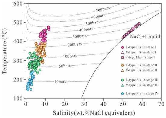 L-type and V-type FIs assemblage from stages II to IV are not the real immiscibility assemblage in porphyry systems and they are not suitable to estimate the accurate trapping pressure conditions. Pressures obtained for such assemblage can only represent minimum trapping values [62]. Based on the simple H2O–NaCl system, using the isobar equations reported in [61], we estimate the minimum trapping pressures in stages II and III range from ~70 to ~300 bar and ~30 to ~150 bar, respectively (Figure 13). The minimum trapping pressures in stage IV occurred at pressures <50 bar (Figure 13).