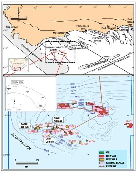 - Petroleum Agency South Africa. Petroleum Exploration Information and Opportunities: Petroleum Agency South Africa Brochure; Petroleum Agency South Africa: Cape Town, South Africa, 2005; pp. 16–18. [Google Scholar]
