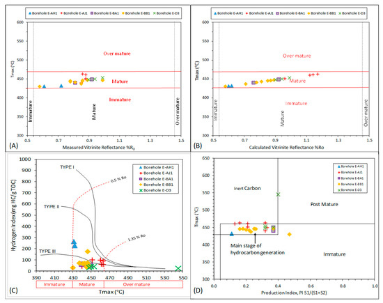 (A) Binary plot of Tmax versus measured vitrinite reflectance showing maturity of the Bredasdorp mudrocks and sandstones (wackes) (after [16]); (B) Binary plot of Tmax versus measured vitrinite reflectance showing maturity of the Bredasdorp mudrocks and sandstones (wackes) (after [16]); (C) Binary plot of hydrogen index versus Tmax (modified van Krevelen diagram) for the selected Bredasdorp Basin mudrocks and wackes showing kerogen type and maturity (after [32]); (D) Plot of pyrolysis Tmax against production index (PI) showing the maturity level and nature of the hydrocarbon products of the Bredasdorp mudrocks and wackes (after [33]).