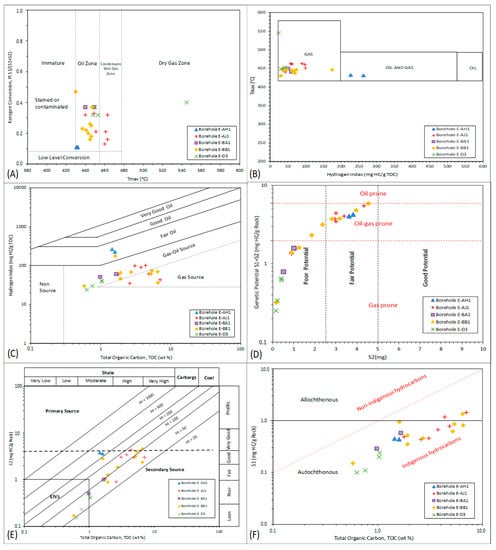 (A) Plot of production index (PI) against Tmax showing hydrocarbon production for the mudrocks and sandstones (wackes) of the Bredasdorp Basin (after [34]); (B) Plot of Tmax versus hydrogen index (HI) showing hydrocarbon generating potential for the of the Bredasdorp mudrocks and sandstones (modified after [34]); (C) Binary plot of HI versus total organic carbon (TOC) showing source rock richness for the Bredasdorp mudrocks and sandstones (after [36]); (D) Binary plot of genetic potential versus S2 for the Bredasdorp mudrocks and sandstones showing generative potential (after [37]); (E) Binary plot of S2 versus TOC plot for source rock quality of the Bredasdorp mudrocks and sandstones (wackes) (after [35]); (F) Binary plot of S1 versus TOC for the Bredasdorp samples showing generated hydrocarbon (after [35]).