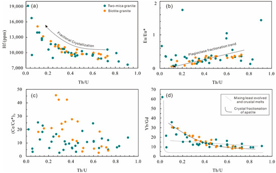 The Eu/Eu* of zircon rims in the biotite granite generally decreases along with increasing Hf content and decreasing Th/U (Figure 2). Although the influence of oxygen fugacity cannot be totally precluded, the enhancement of a negative Eu anomaly might be dominantly controlled by plagioclase fractional crystallization [30]. Zircon rims in the two-mica granite generally have a Eu/Eu* broadly lower than 0.4, but some scattered values are in the range of 0.6 to 1.8 (Figure 2b). In this case, crustal contamination as discussed above may play a vital role in evolution of the two-mica granite.