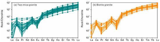 Chondrite-normalized [25] rare earth elements of zircons from the two-mica granite (a) and biotite granite (b).