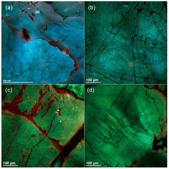 The quartz grains in the biotite granite and two-mica granite are green and bluish red in ChromaSEM–CL (Figure 4). They are dominantly homogeneous and composed of only one generation of primary igneous quartz. A few quartz grains show oscillatory zoning at μm scale, revealed by small-amplitude variations in CL (Figure 4d). Secondary textures in the magmatic quartz from the Nashwaak Granite include: (1) dark CL streaks and patches associated with fractures; (2) healed fractures, which do not show up in BSE images, and are likely filled by nonluminescent SiO2 (see [26]); and (3) opened fractures.