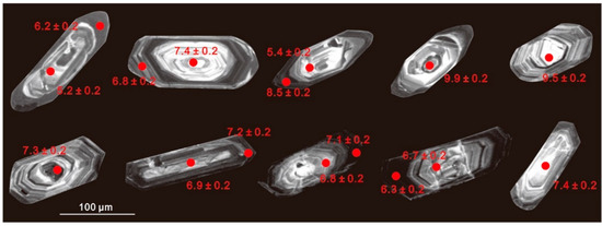 If quartz and zircon are in isotopic equilibrium at a particular temperature, then their δ18O values should lie along a straight line in a plot of δ18OZrc vs. δ18OQtz (see Figure 5b in [11]). In the biotite granite, the δ18OZrc value of the magmatic rim is broadly homogenous (from +6.3‰ to +7.2‰). Consequently, the zircon and quartz in the biotite granite might have formed in a closed system and equilibrated with their hosting magma during crystallization. The average δ18O values of zircon rims and quartz are +6.8‰ and +9.7‰, respectively. The value of ΔQtz-Zrc is 2.9‰ and the calculated temperature is 688 °C (Tables S1 and S2; [40]) or 675 °C [39].