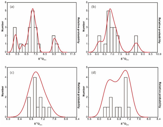 Cumulative probability histograms of δ18OZrc of the zircon cores (a) and rims (b) from the two-mica granite, and zircon cores (c) and rims (d) from the biotite granite.