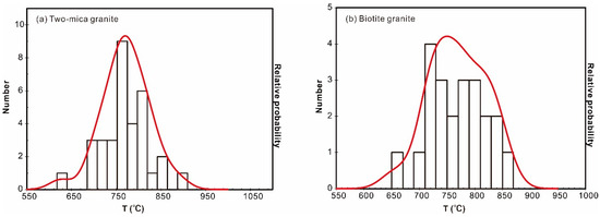 Cumulative probability histograms of the Ti-in-zircon thermometer [31] for the two-mica granite (a) and biotite granite (b).