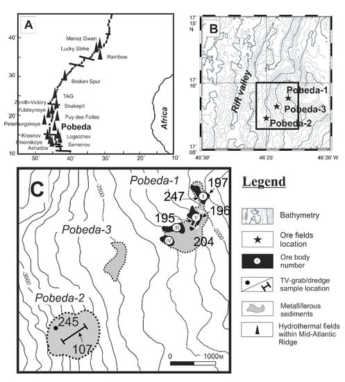 The Pobeda massive sulfide hydrothermal field was discovered on the eastern flank of the Mid-Atlantic Ridge rift valley (17°08′ N) (Figure 1) during for 37th cruise (2014–2015) of the Russian R.V. Professor Logatchev by the Polar Marine Geosurvey Expedition (PMGE) in collaboration with VNIIOkeangeologia, Saint-Petersburg, Russia [31,32]. The Pobeda SMS deposit is located on the western slope of an oceanic core complex at depths between 1950 and 3100 m. The host rocks are composed of serpentinized peridotites, serpentinites, gabbros, basalts, and dolerite dykes [33]. The hydrothermal SMS deposit consists of the Pobeda-1 and Pobeda-2 hydrothermal fields and the Pobeda-3 sulfide occurrence (Figure 1).