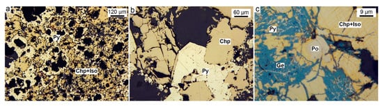 Aggregates of subhedral crystals of isocubanite and chalcopyrite contain disseminated euhedral and subhedral pyrite. Their atoll-like microtexture (Figure 2a) were probably formed due to recrystallization of primary unstable fine-grained sulfides. Unzoned subhedral and euhedral pyrite crystals were encrusted on the walls of the microcavities (Figure 2b). Isocubanite crystals were complicated by lattice-controlled chalcopyrite lamellae. Relic pyrrhotite-Fe0.9S inclusions occurred in the isocubanite-chalcopyrite aggregates. The aggregates were replaced by covellite and geerite—(Cu9S5) with latest pyrite veinlets (Figure 2c).
