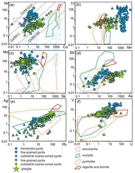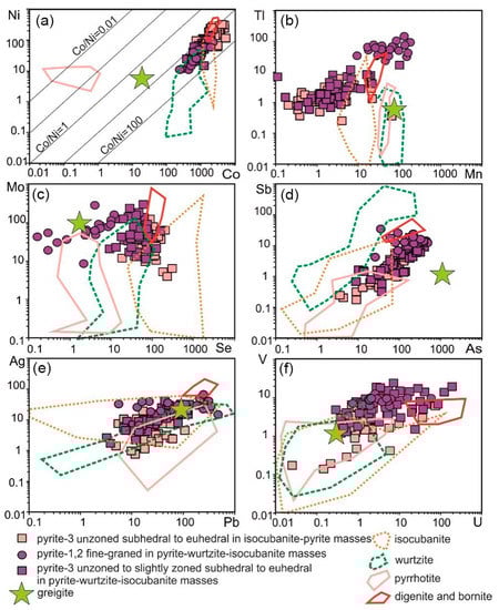 The distribution of most pyrite-3 plotted points was similar to isocubanite in several diagrams (Figure 3). The exception was Ni with higher concentration in pyrite-3 as well as in submarine supergene bornite and digenite as opposed to isocubanite (Figure 3a). The contents U, V, and Mo were commonly low or variable in pyrite-3 and isocubanite (Table 1).