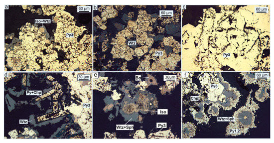 In a fragment of the coarse-grained pyrite-wurtzite-isocubanite microfacies, the crystal habits of pyrite evolved from anhedral through euhedral and massive texture with increasing crystal sizes of the aggregates in a direction towards the conduits (Figure 4a). Most of the crystals were unzoned or had poor relic zonation. One or two zones were recognized in a single crystal (Figure 4b). Relic pseudomorphs after pyrrhotite consisted of anhedral pyrite (Figure 4c). In the conduits, this pseudomorphic pyrite was partly replaced by chalcopyrite and was surrounded by wurtzite-sphalerite aggregates (Figure 4d). Isocubanite was partly replaced by bornite mixed with sphalerite (Figure 4a,e). All of these sulfides were overgrown by later fine-grained pyrite rims (Figure 4f).