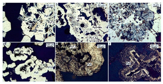 Varieties of pyrite in pyrite microfacies-196 (Sample 37L-196-1 and 37L-196-2). Pobeda-1 hydrothermal field. (a) relic inclusions of isocubanite (Iso) and wurtzite-sphalerite (Wtz) in aggregates of subhedral pyrite (Py2); (b) relic inclusions of greigite (Grg) with pyrrotite, marcasite (Ms), and phase Fe2S3 aggregates are partly replaced by porous fine-grained pyrite-1,2 (Py1,2) overgrown by subhedral pyrite-2 (Py2); (c) greigite (Grg) and phase Fe2S3 (Fe2S3) is replaced by pyrite-1,2 (Py2) and marcasite-1 (Ms); (d) atoll microtexture of pyrite-2 (Py2) with relic pyrite-1,2 (Py1,2); (e) oscillatory coarse-zoned pyrite-2 (Py2) envelops relic fine-grained pyrite-1,2 (Py1,2); (f) pyrite pseudomorphs after euhedral crystals of pyrrhotite are overgrown by oscillatory coarse-zoned pyrite-2 (Py2). Reflected light. Some pyrite varieties (e,f) are etched by HNO3 + CaF2.