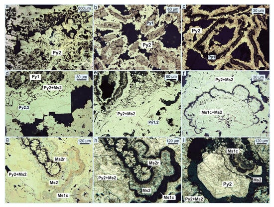 Varieties of pyrite in reniform-rich pyrite microfacies of the hydrothermal crusts (sample 37L-107-10). Pobeda-2 hydrothermal field. (a) porous marcasite-pyrite (Py2) crust; (b) pseudomorphic spongy pyrite-1 (Py1) is overgrown by anhedral and subhedral crystals of pyrite (Py2); (c) pyrite-2 (Py2) aggregates envelop and drape over boxy spongy pyrite pseudomorphs (Py1) after pyrrhotite; (d) successive overgrowth of pyrite-1 (Py1) by subhedral marcasite (Py2+Ms2) and pyrite (Py2,3); (e) brecciated marcasite-pyrite (Py2+Ms2) aggregates; (f) reniform marcasite-1 and -2 (Ms1c+Ms2) in crystalline marcasite-pyrite (Py2+Ms2) aggregates; (g,h,i) overgrowth of colloform (Ms1c) and radiated (Ms2r) marcasite by crystalline marcasite (Ms2) and marcasite-pyrite (Py2+Ms2) aggregates. Reflected light. Some pyrite varieties (c,h,i) are etched by HNO3 + CaF2.