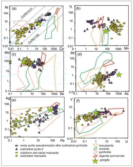 Colloform-like marcasite-1 had marginally higher concentrations of Mn and Ag in comparison with crystalline pyrite varieties. In general, all marcasite varieties of the hydrothermal crusts had low concentrations of the most studied trace elements except for Mo and Mn. The Mn concentration decreased from colloform to radial and subhedral marcasite varieties. In all these iron sulfides, the Co/Ni ratios were <1. Spongy pyrite-1sp had much higher contents of most trace elements, except Mn, than marcasite-1c (Table 5, Table S5). The data are illustrated in Figure 9. Despite lower concentrations of Co and Ni (Figure 9a), marcasite showed the same linear distribution for these elements as the pyrite of microfacies-195 (Figure 9b–f). The Mo contents were much higher in marcasite than in pyrrhotite (Figure 9c). Marcasite plotted points showed lower concentrations of As, Ag, and U in comparison to pyrite in the following diagrams (Figure 9d-f). Uraninite was found in subhedral pyrite-2,3 only.
