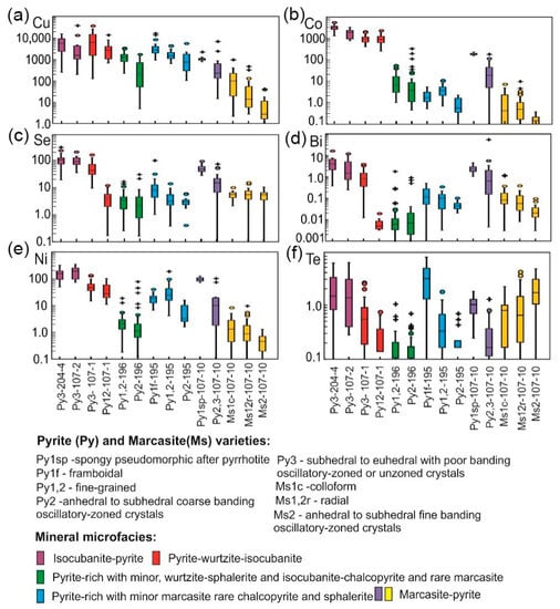 Whisker-and-box plots for the high-temperature association of elements Cu (a), Co (b), Se (c), Bi (d), Ni (e), and Te (f) in pyrite and marcasite ranged in isocubanite-rich, pyrite-, and marcasite-pyrite-rich microfacies. The box encloses the interquartile range with median displayed as a line. The vertical lines extending outside of the box mark the minimum and maximum element concentrations encountered. Outliers are plotted as single points.