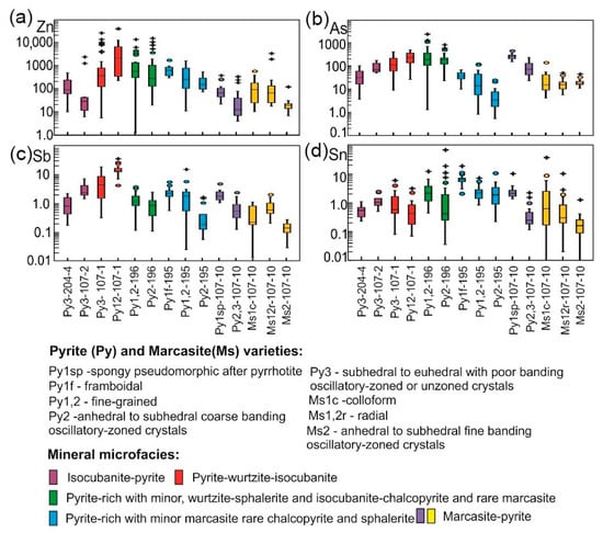 Whisker-and-box plots for the moderate temperature association of elements Zn (a), As (b), Sb (c), and Sn (d) in pyrite and marcasite ranged in isocubanite-rich to pyrite and marcasite-pyrite rich microfacies. The box encloses the interquartile range with median displayed as a line. The vertical lines extending outside of the box mark the minimum and maximum element concentrations encountered. Outliers are plotted as single points.