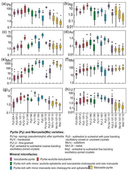 The highest contents of Tl, Sb, and Pb are typical of fine-grained pyrite in comparison to crystalline pyrite varieties. The boxplot for Tl is comparable with those for Pb, Sb, and Ag (Figure 12a–c). Thallium is likely incorporated into galena dispersed in colloform pyrite via the coupled substitution: Tl+ + (Bi, Sb)3+ ↔ 2Pb2+ [37]. Probably, this manner of substitution occurs in fine-grained pyrite of pyrite-wurtzite-isocubanite microfacies. Thallium could also be involved in nonstoichiometric substitution in the lattice of pyrite [43].