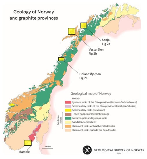 Graphite is a common mineral in meta-supracrustal rocks of mid- to late-Proterozoic age on the Fennoscandian shield. There are more than 50 occurrences in Finland, Sweden, and Norway [55,57,67]. The graphite occurrences from Senja, Vesterålen, and Holandsfjord areas are all located within Archaean to Proterozoic basement provinces that occur as basement windows within younger Caledonian rocks.
