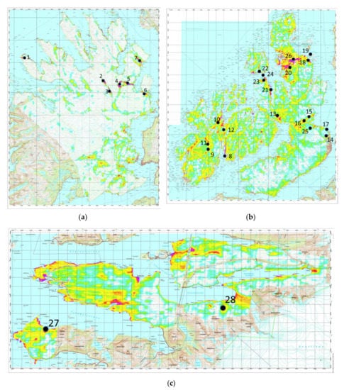 Maps of airborne EM (7000 Hz) with graphite occurrences: (a) Senja, (b) Vesterålen, and (c) Holandsfjorden. The names of occurrences are listed in Table 1, compiled from data reported in [51,59,60]. See links in the text for access to map files in high resolution.