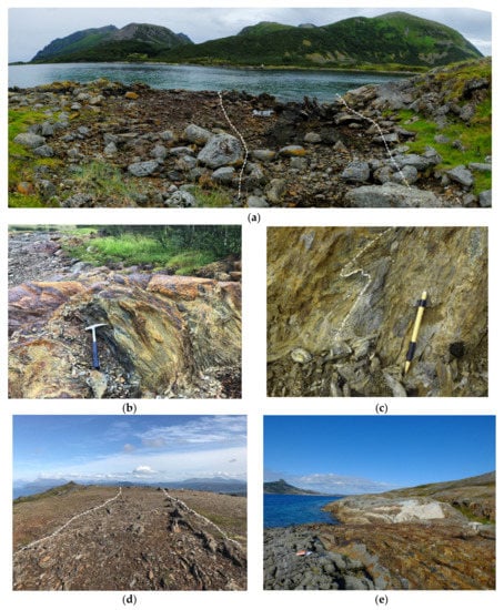 (a) Well-exposed massive graphite schist (Svinøya, occurrence 24). (b) Typical rusty, weathered, and strongly schistose graphite schist (Grunnvåg, occurrence 6). (c) Close-up of typically foliated and tightly folded graphite schist, foliation indicated (Vardfjellet, occurrence 2). (d) Outcropping graphite schist continuing about 100 m along strike (Bukken, occurrence 4). (e) Outcrop showing from left to right a gradual transition from amphibolitic schist into rusty graphite schist that are intruded by younger granites to the right (Nord-Værnes, occurrence 27).