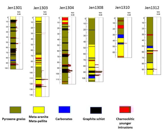 The graphite schist represents the most weathered and poorly exposed rock in all three areas. Field exposures are only available on a few coastal exposures, road cuttings, and exposed flat-lying areas in the mountains. The graphite schist is typically rusty brown, strongly schistose, and commonly tightly folded (Figure 3b,c, deposits No. 4 and 6 on Figure 2a). The graphite bands can vary in thickness from cm scale to several tens of meters (Figure 3a, No. 24 on Figure 2b), and exposures can be followed for up to about 100 m (Figure 3d, No. 4 on Figure 2a). The graphite schist is usually, at well-exposed localities, part of a rock unit that includes amphibolite-bearing schists, and which is typically also intruded by different types of younger intrusion (Figure 3e). In all the described graphite provinces, graphite schist seems to be part of a succession that comprises pyroxene gneisses, quartz-feldspar-rich rocks (metapelites to meta-arenites), carbonates (mostly dolomites), and less common iron formations [52,59,64]. At localities where drill core data are available (sections over lengths up to 140 m), the graphite bearing sections appear randomly distributed with thicknesses varying from a few centimeters to ca. 10 m. The proportions of the host rock; pyroxene gneisses or quartz-feldspar rocks vary widely. In some localities, graphite schist shows a gradual transition into carbonates (Figure 4) (See supplement data for details). We believe that the relationship between graphite-rich units in succession is that they, in all probability, show that the graphite was part of a sedimentary sequence that underwent metamorphism that resulted in formation of graphite.