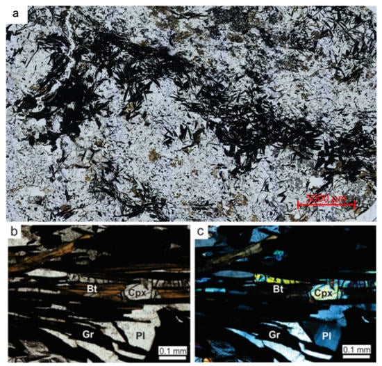The graphite content typically ranges between 10–25 vol %, but a modal content up to 90% is found locally. Graphite crystals in hand samples usually occur as silvery shining minerals. Graphite occurs as single, well-developed flakes or as subhedral interstitial grains between silicate minerals, in aggregates 1–5 mm in size. Together with biotite, oriented graphite crystal forms a well-developed foliation and contributes to the rock schistosity. Pyroxenes, quartz, and feldspars constitute anhedral matrix minerals with metamorphic, triple-point grain boundaries and are normally fine- to medium-grained in size (Figure 5b,c).