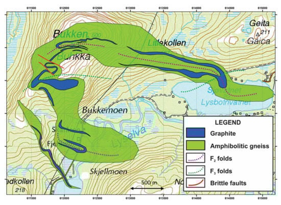 Reference [118] first studied in detail the various graphite deposits on the island of Senja. Ref. [91] also characterised the complex structural episodes as having both created and modified the graphite deposits and found that the graphite is intimately associated with the development of F2 folds, as graphite is best developed geographically in association with N-S-striking F2 fold hinges. However, the F2 fold hinges are deformed by D3 deformation on approximately E-W axes. This created complex interference geometries. The graphite is most extensive geographically where F3 structures intersect graphite-bearing F2 structures. The extent of graphite outcrop is also strongly affected by the presence of both F2 and F3 shear-zone structures, which locally (F2) or regionally (F3) ‘shear-out’ the graphite outcrops, thereby limiting the extent of the graphite deposits.