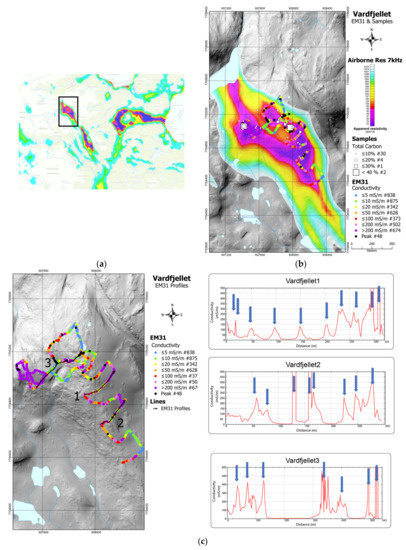 (a) Part of the airborne geophysical map showing the location of Figure (b). Airborne geophysical map with superimposed sampling points analysed for TC and measurements done with EM 31. (c) Sampling traverses of EM31 and, to the right, variation in apparent conductivity in three traverses, where peaks (blue arrows) show the location and apparent width of near-surface graphite lenses. This shows that airborne geophysics comprises several individual subparallel graphite lenses. A complexity that would not been resolved with airborne geophysics only. Data from occurrence two (Vardfjellet). Based on data from [51].