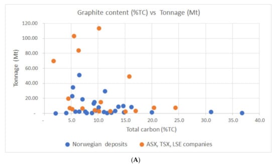 The graphite content of the samples was analyzed using a LECO SC 632 carbon and sulphur analyzer (LECO, St. Joseph, MI, USA). Three variants of LECO type procedures are normally used for graphite analysis. After crushing and milling the graphite, the content can be determined by: (A) removing any inorganic carbonates by acid, roasting the sample to remove organic plant material, and finally analysis using a LECO type of instrument; (B) analysis of total organic carbon (TOC) similar to A, without the roasting step; and (C) measurement only by Leco analyzer (, without removing carbonates or organic matter: the latter method gives the total carbon (TC). Rønning et al. [60] reports both TOC and TC for a number of samples and compared these methods and showed that for the majority of our samples, TOC and TC only deviated within the analytical uncertainty. Therefore, on >90% of our samples only method C was used, which is the fastest and least costly. Table 1 shows the average % TC for our occurrences, and the complete dataset of 679 analysis of TC, TOC, and total sulphur (TS) analyses are reported in [51,60], data used in this paper is available in the supplementary data.