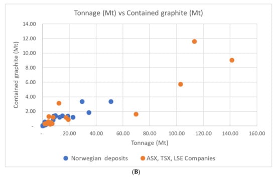 The average deposit size (in Mt) clearly differs from Senja, with 20.8 Mt compared to Vesterålen where it is 6.3 Mt. A possible geological explanation for the differences could be related to the 1.8–1.79 Ga magmatic event [71]. In Vesterålen, where the AMCG rocks intruded and dismembered the older rocks, including the graphite units, to a much larger extent than on Senja. Younger intrusions are much less apparent on Senja. The degree of exposure of the graphite-bearing units is, however, small and the relationship and proportion between size of graphite occurrences and younger intrusions cannot be exactly quantified.