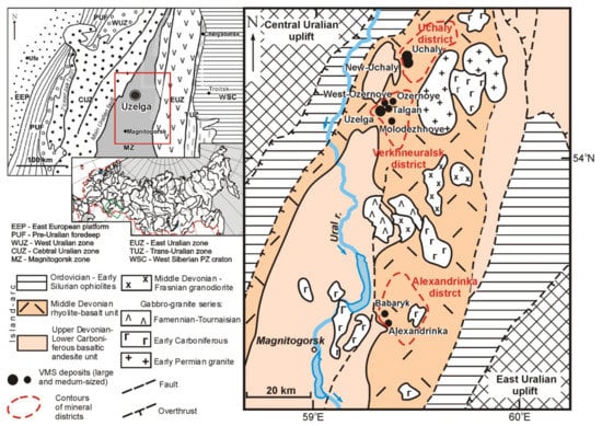 Figure 1. Schematic geological map of the Uchaly-Alexandrinka volcanogenic massive sulfide (VMS)-bearing area of the North Magnitigorsk zone, South Urals. Modified after [44]. The position of the Magnitogorsk zone in the structure of the South Urals is shown in the top left (modified after [98]).