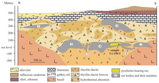 The ore bodies of the deposit are mostly hosted by felsic, locally, altered rocks which form a large structure reminiscent of a volcanic dome (Figure 2). Primary volcanic structures are weakly deformed by small-amplitude faults. The ore-bearing basalt-rhyolite series belongs to the Upper Eifelian Karamalytash Formation and roughly corresponds to the australis-kokelianus zones [41], ca. 389 Ma [86]. The rocks are overlain by Givetian limestones, Lower Frasnian chert-siltstone horizon and Middle-Upper Frasnian volcano-sedimentary basalt-basaltic andesite unit [83]. The group of parallel WNW-trending subvolcanic mafic dikes of Givetian (?) age, which form thick (up to 20–30 m) steeply dipping bodies, cut the rocks of the Uzelga deposit [33,34].