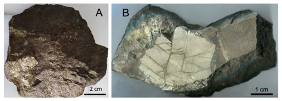 Figure 4. Macrophotographs of the fragments of pyrrhotite-pyrite-sphalerite-chalcopyrite ore of the lower horizon (sample Uz-190-5, level −550 m) in the southern part of ore body No. 4 (Figure 2 and Figure 3). There are a few large porphyroblasts of pyrite in the left bottom part of the photograph (A) and large polycrystalline pyrite porphyroblast in pyrrhotite-dominated ore (B).