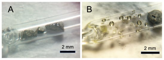 Figure 5. (A) Pyrite grains in quartz ampoule before He extraction; (B) products of thermal decomposition of pyrite grains after annealing in sealed quartz ampoule at temperature ~1100 °C.