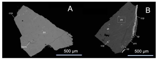 Figure 6. Scanning electron microscopy (SEM) images of selected pyrite grains from the Uzelga deposit. py—pyrite (FeS2), ccp—chalcopyrite (CuFeS2), hem—hematite (Fe2O3), sp—sphalerite (ZnS), alt—altaite (PbTe), urn—uraninite (UO2). (A) pyrite with minor hematite; (B) pyrite with tiny inclusions of altaite, sphalerite and chalcopyrite as well as sphalerite-chalcopyrite veinlet (with associated uraninite).