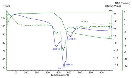Thermal analysis showed no thermal effects (the absence of oxidation or sulfur release) within the temperature range 25–400 °C, which indicates the high degree of stoichiometry of pyrite (Figure 7). No thermal effects that might be associated with the decrepitation of fluid inclusions were also observed. Three exothermic effects at the DSC curve at 480.3, 552.2–568.5 and 612.0 °C, were accompanied by mass loss, as indicated by the TG and DTG curves. The first two effects correspond to the breakdown of pyrite to pyrrhotite and magnetite [108,109]. The third effect may correspond to the decomposition of sphalerite inclusions [110].