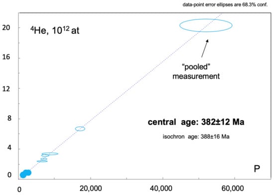 Figure 8. Linearized U-Th-He diagram for pyrite from the Uzelga deposit. According to the linear age equation, the U-Th-He age is given by the slope of the regression line; the “pooled” age is a “synthetic multi-grain age” calculated from the summed production rates and helium-abundances of all the measurements [104]. Uncertainty represents 2 σ. Solid circles indicates grains, which uncertainty envelope is too small to be visualized. Isochron age is calculated in Isoplot Excel add-on from a regression line [111].